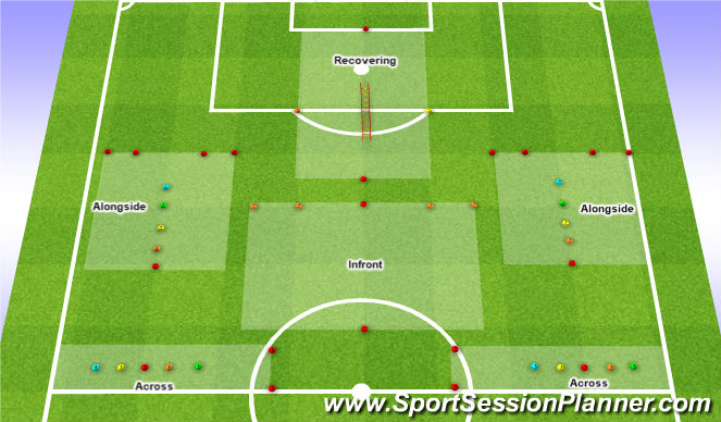 5. After executing this a couple of times, a coach may decide to have a player stationed at the Right/Left cone with a ball to replicate a game realistic scenario. Once the ball is added, defenders should looks to put their body in between the player and the ball.