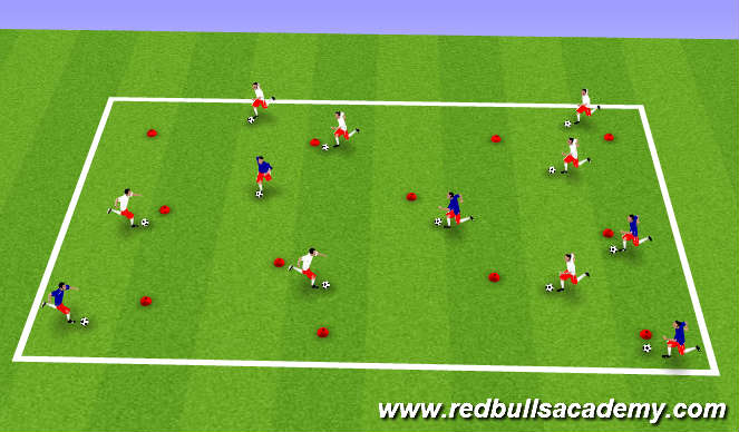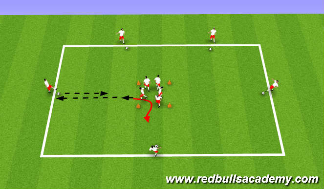 1.- First player from each group dribbles at the same time to the nearest cone in the middle then pass the ball to the group on their left using inside of right foot.