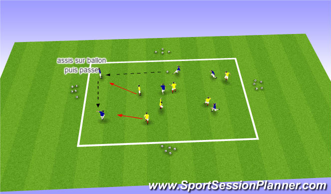Evolution: Marque= s'asseoir sur le ballon et passer à un partenaire pour marquer.