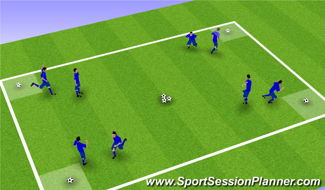 20 x 30 yard Split players into 4 equal teams and position them at the corners. Place the soccer balls in the middle. Players go ONE AT A TIME from each team to get a soccer ball (Pick it up) from the middle and bring it back to their corner. Once they're all gone, they can steal from their 2 neighbors.