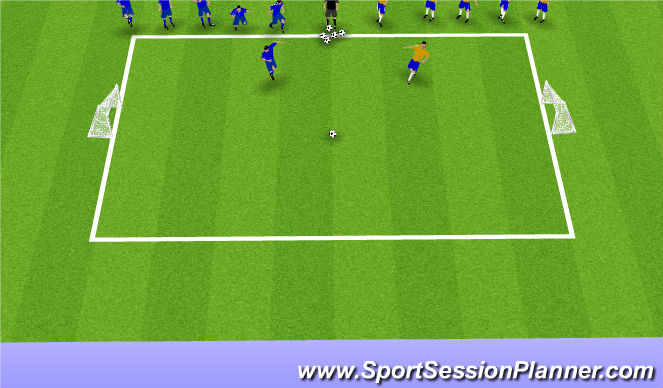 20 x 30 yard area. Split into 2 teams. Coach rolls ball into middle, call out a number, that's how many players run out and compete to score, either 1 v 1, 2 v 2, or 3 v 3