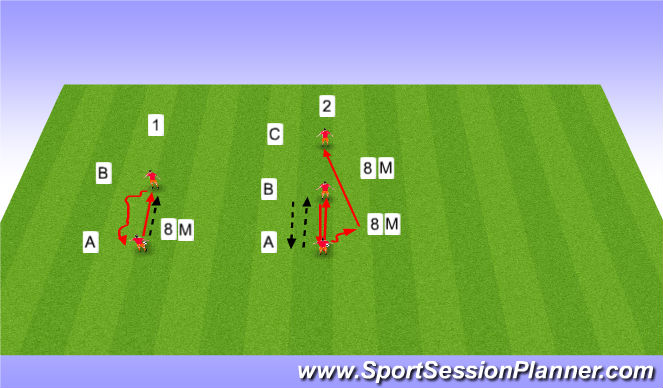 2. Spelare A slår en passning till spelare B som gör ett rakt tillbakaspel. Spelare A slår en passning till spelare C. A och B byter plats. C börjar om övningen.