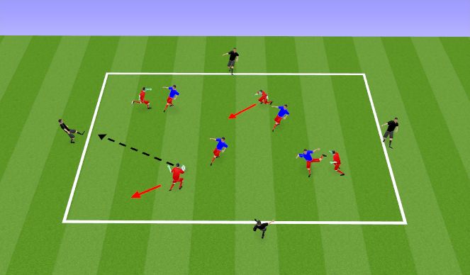 Teams inside the square look to make 10 consecutive passes. Players on the inside can play to each other or the players on the outside. Outside players can not pass to each other. Rotation after 4 minutes.