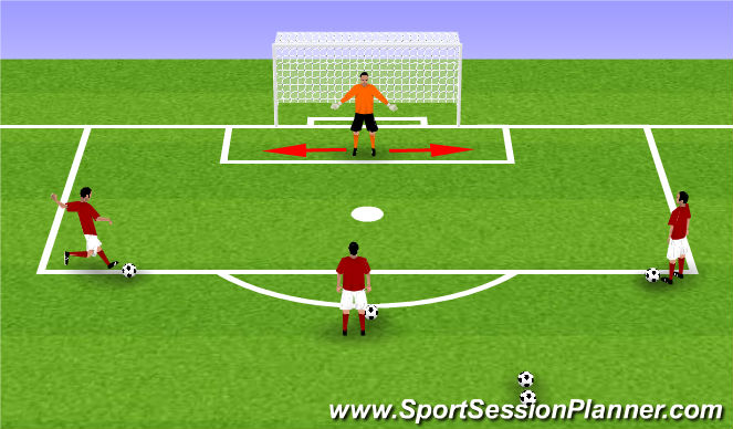 For this drill the GK will be working on both diving and quickness. Server 1 will give a ball to the near post, far post x 2 and then the near post again before the GK runs across the goal to face a shot from Server 2. As soon as the GK makes a save or the ball is scored/missed Server 3 will serve their shot.