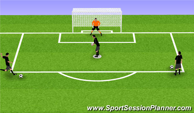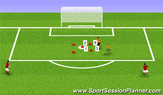 Note: I use a penalty box trainer for this but gladly feel free to use standard cones or as you see fit.