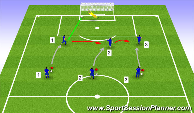 2. Create half a yard of space, positive first touch, drive into space, Encourage players to use both feet to shoot.