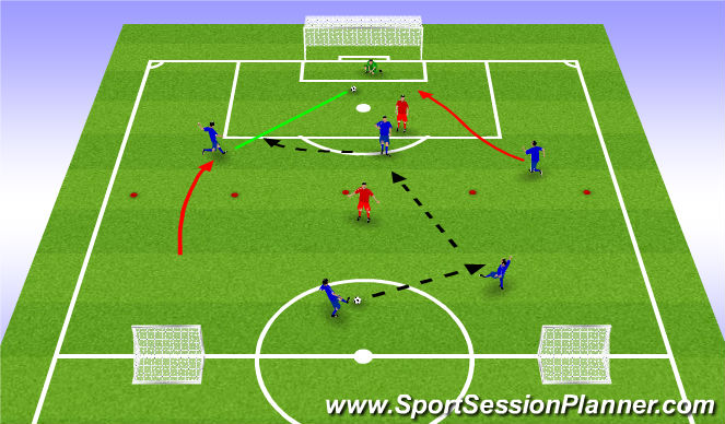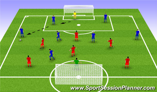 2. Ball starts with coach, players cant move into the other half apart from one attacking player (Blue) who may advance across half by dribbling or receiving a pass.