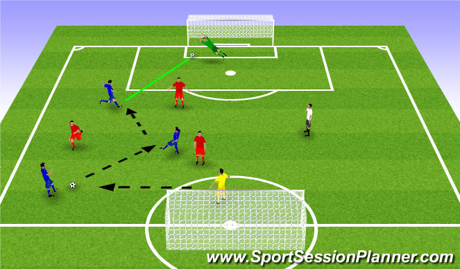 1. Three vs one in first half (small goals) and two vs one in the second half (big goals).