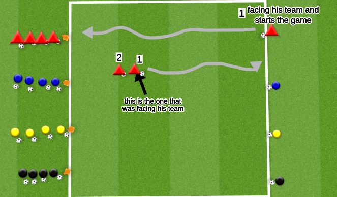 #1 and # 2 go the the line and then go get #3. This continues till all of them cross the side of where the cone is.