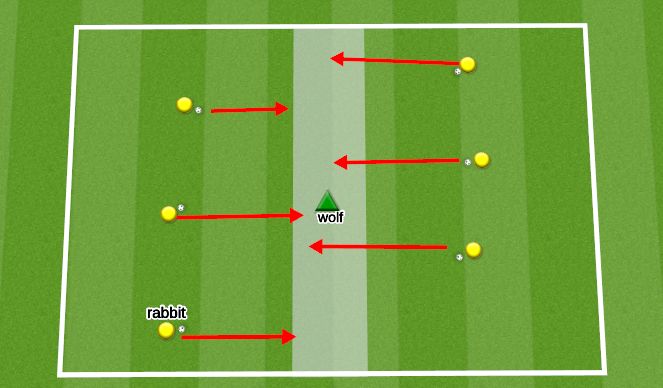 Coaching points - head up, speed drill - longer touches then shorter to stop by goal, different surfaces, change of direction/pace to dodge wolf