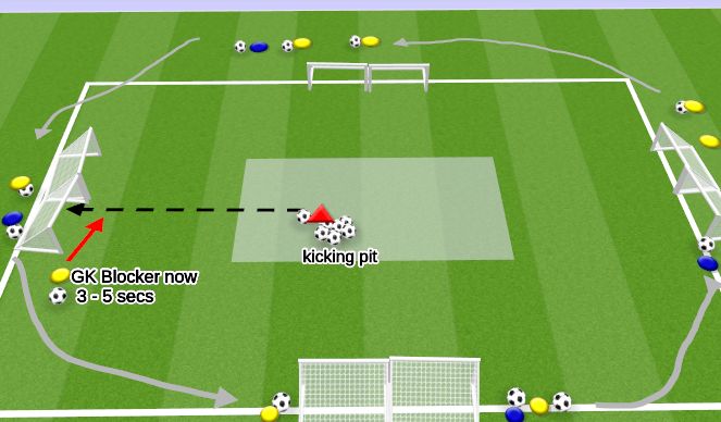 -Red player starts the game by selecting any goal he wants to shoot in. the other players are dribbling around the goals, they can come out a block a shot for 3 - 5 secs without their ball and then they need to continue dribbling to the next goal. THEY DO NOT HAVE TO COME OUT BY EVERY GOAL BUT CAN. NEED TO BE RIGHT BEHIND GOAL TO COME OUT.