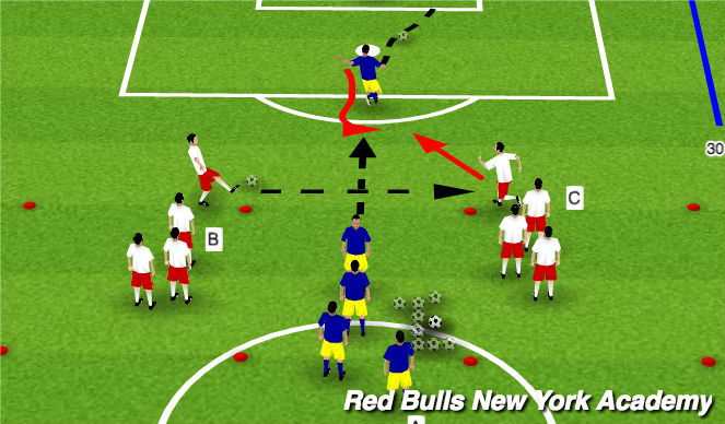 - The next player in line A plays a ball through the shooter's legs who turns and goes 1v1 with the goalie.