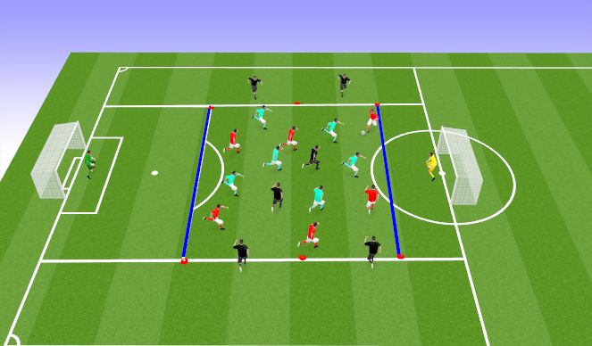 Empieza el juego sacando el portero del medio campo sobre equipo rojo, el cual deberá intentar llegar a 10 toques consecutivos, ayudándose de los 6 comodines, para poder rematar a la portería de la línea de fondo. Si el equipo defensor roba podrá finalizar, pero en la portería del medio campo; tras los primeros tres minutos se cambia el rol de los dos equipos que estaban enfrentándose, ahora el otro ataca y el otro defiende.