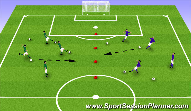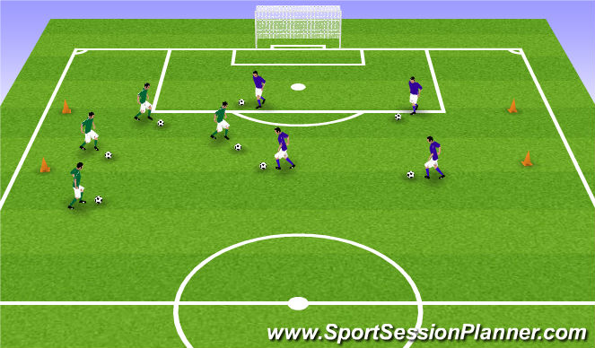 - Game starts with both teams on their endline, all with their own ball. On the coach's signal, all players dribble to the opposite end to score a goal.