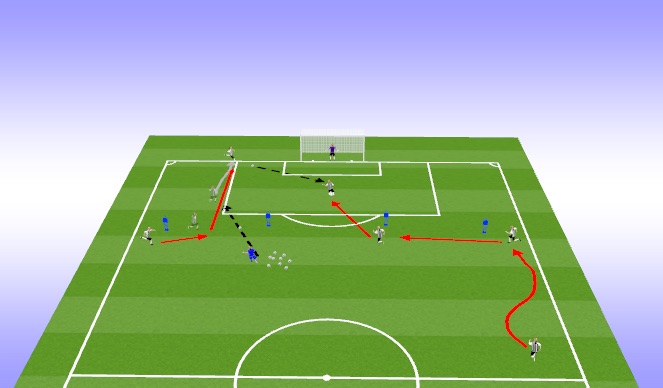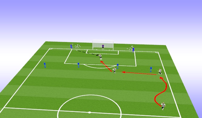 Instructions: coaches now play a through ball to setup the "cutback". One players drives to the bye line, and performs a cutback, while the other player must time their run into the box, and finish the shot.