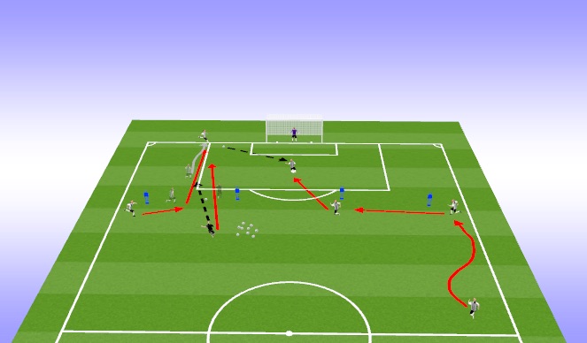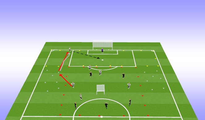 Instructions: coaches feed in quality passes and players run in and finish. The player can go our and around a mannequin and re-enter the 18yd box a second time to receive a second pass from the coach on the other side.