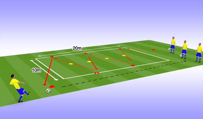 When a player reaches the top of the drill they pass the ball down the side to another player