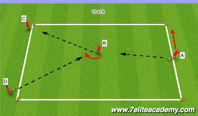 Play begins with a pass from Player A to into Player B who opens up quickly and Passes to player C .