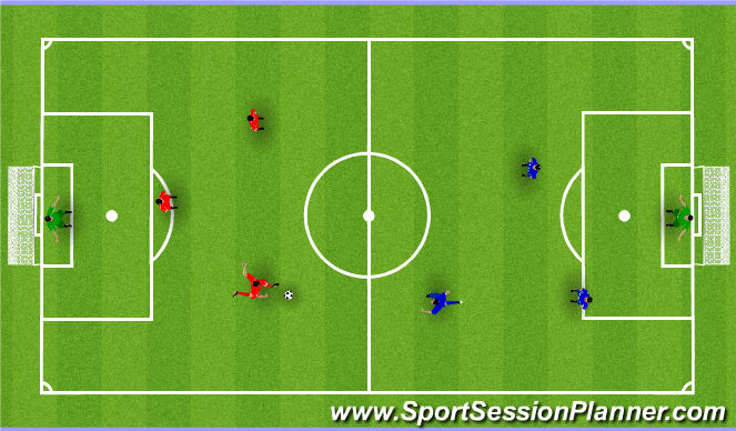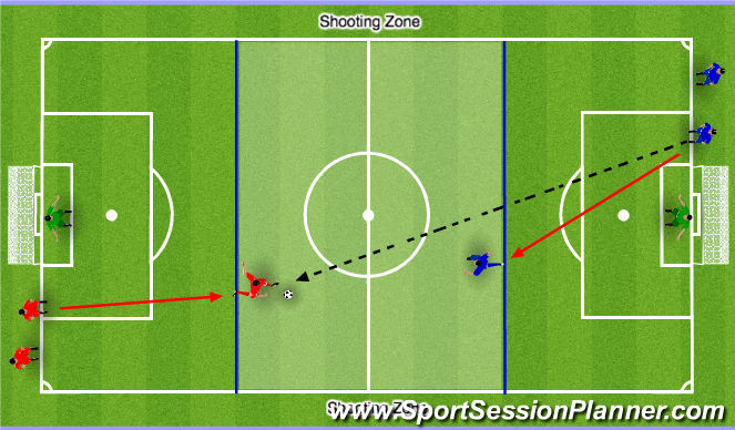 The blue team starts at the opposite end to the red team. The blue player passes into the red player. The red player attacks and attempts to shoot in the middle zone. The blue player attempts to win possession or block the shot.
