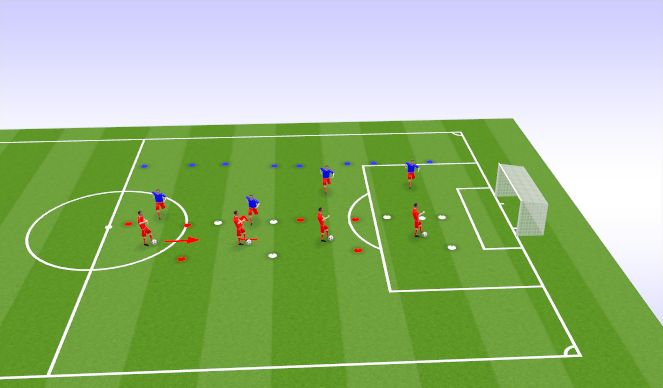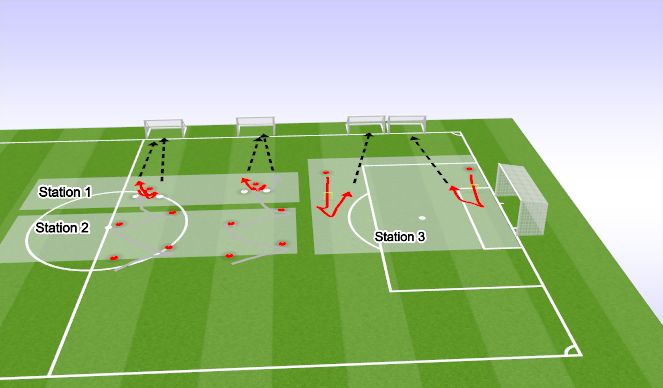 Station1: Split the groups into 2 groups with 1 ball to each player. Both groups 1 at a time are working on 4 v cuts in the triangled cones. Once they've completed 4 they take there touch out of the cones, finish into the goal, retrieve their ball and go to the back of the line