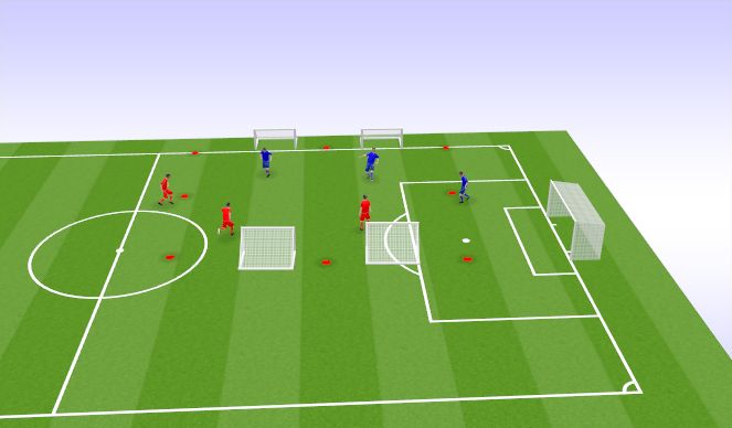 - Attackers start with foot on the ball (if they can do it have them start normal but starting with the foot on the ball might just make it easier for them to understand the task) and have to wait until the defenders cross the first gates (cones) before they can move the ball. Once the defenders cross the gates the attacker has the decision to either run directly forward with the ball through the front gate or do a v cut and run through the side gate.