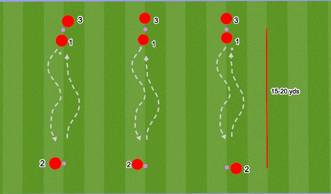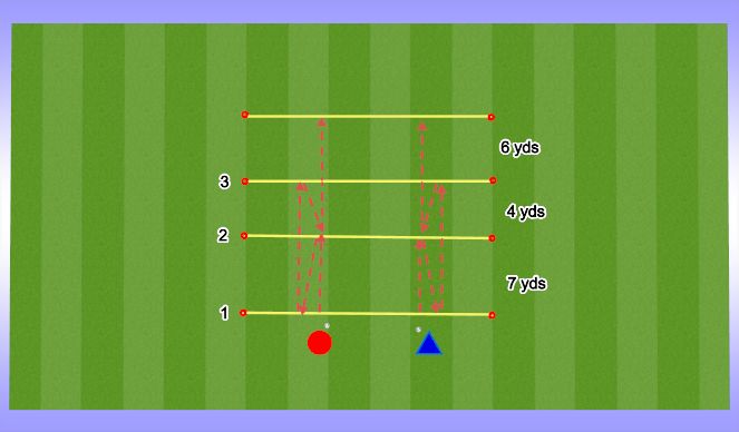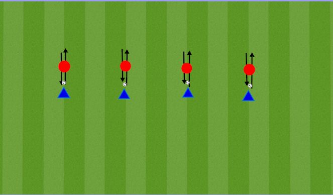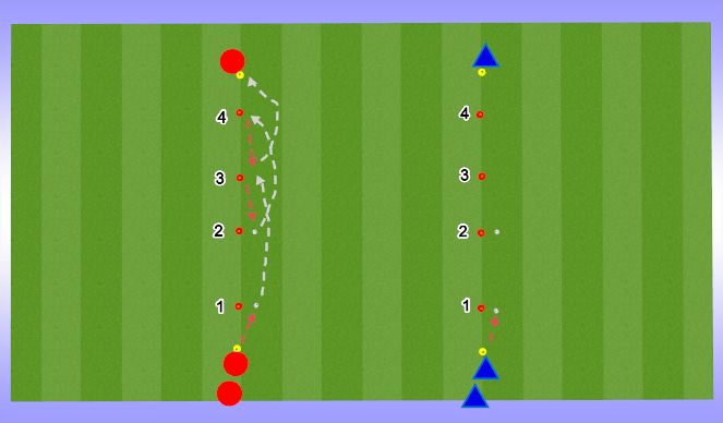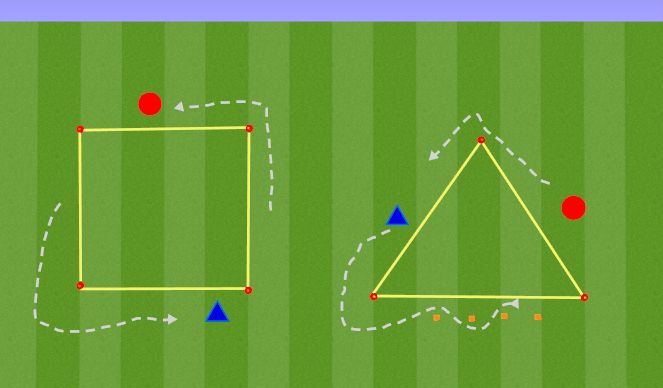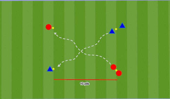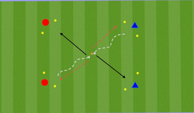 -To introduce triangle play (wall passes), the receiver has to return the ball immediately into the run of the passer who runs into the opposite goal. After 10 triangle passes both players change functions.