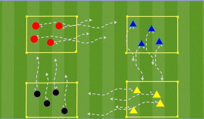 -Two players dribble their ball to the opposite corner of the square (about 10 yds away), trying to avoid each other player while crossing the path.