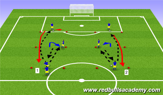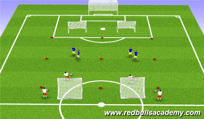 - receiving player works with supporting player to score in small goal, looking to play double pass to open up passing lane for supporting player to score