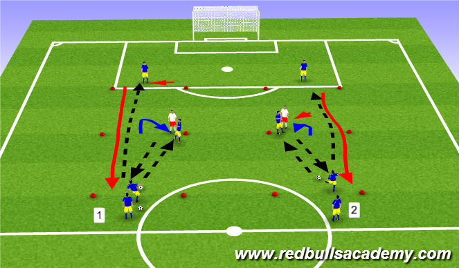 - target player with the ball plays into his teammate in the central area, defender must allow attacking player to have the first touch on the ball, but attempts to win the ball and score in conter goal after the 1st touch
