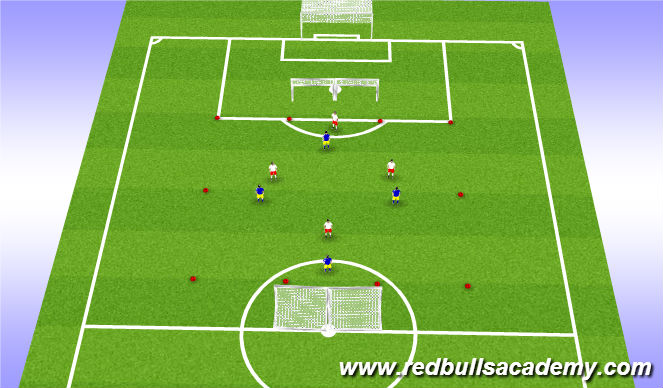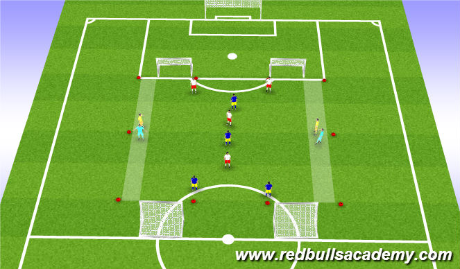 - 4v4 in central area (3v1 in each defensive half), with 2 targets for each team the wide channels (1v1 in wide areas) and 1 target in the attacking half of the field