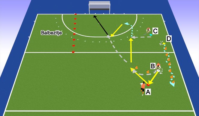 Bij D hoeft niemand te beginnen. Je pakt een bal, slalomt door de pionnen, legt bal bij B en loopt naar A.