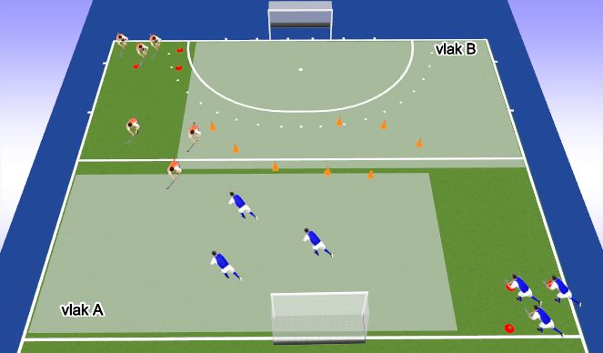 Allereerst staan er 3 verdedigers in vak A. Vanuit de hoek beginnen 3 aanvallers, 3vs3. Deze scoren bij goal op de middenlijn.