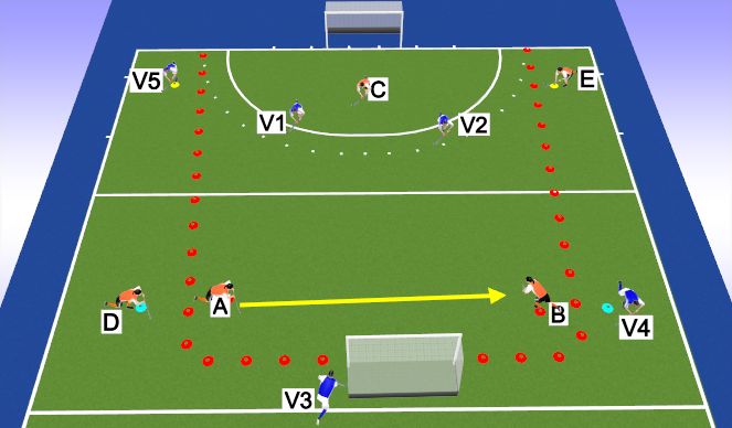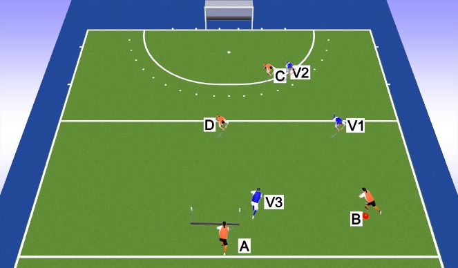 A passt bal naar B. Vanaf dan start de 3vs2 --> B, C en D tegen V1 en V2. B-C-D scoren bij grote goal.