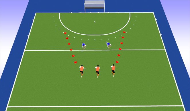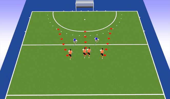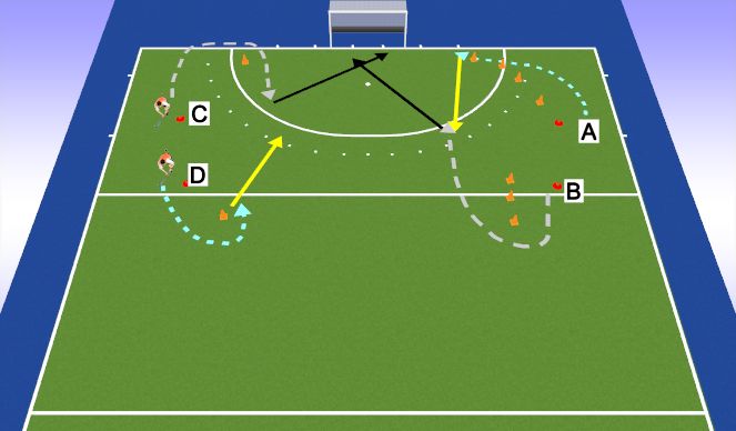 2) C rent om de pion en komt naar de kopcirkel gerend. D is om de pion gelopen en speelt zodra C dat aangeeft een harde bal naar C die afrond (forehandschot)