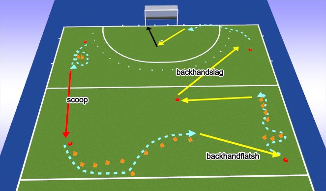 1) A loopt om de pionnen met de bal richting achterlijn. B is ondertussen om de 3 pionnen gaan rennen en biedt zich aan rond de kopcirkel (backhandschot)