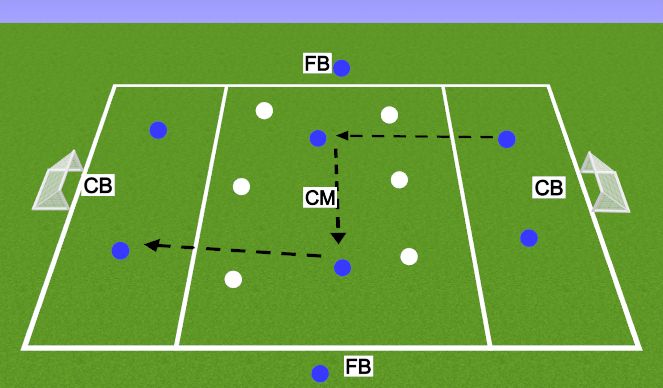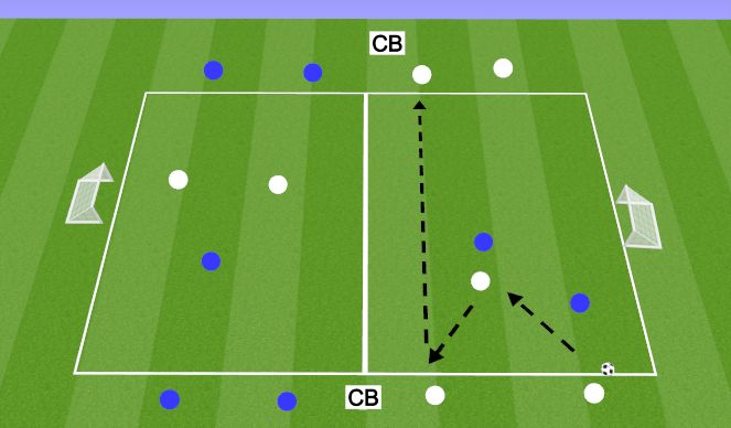 Two CBs on either end of the pitch. 2v1 in the centre. For a point, the ball must travel from one end to the other. CB can pass directly to the other side if possible. If the opposition wins the ball, try to score a goal.