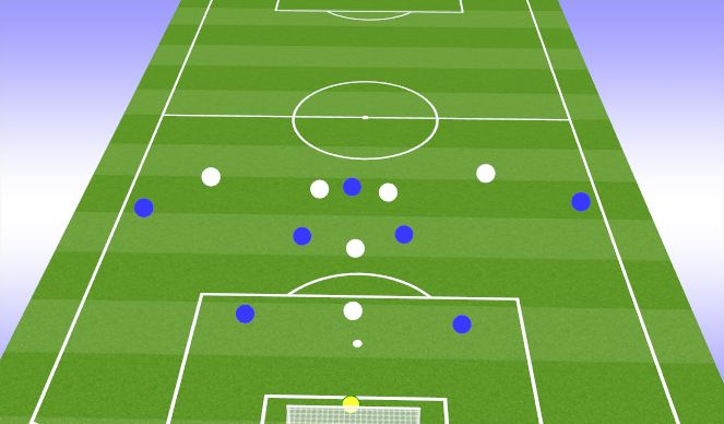 8v6 Positional Rondo. A team of 8 have to work the ball from one end of the field to the other and must stay in their zone. A team of 6 have free movement and must win the ball and have 5 seconds to score in either goal. When the ball leaves the field, always restarts from CB.