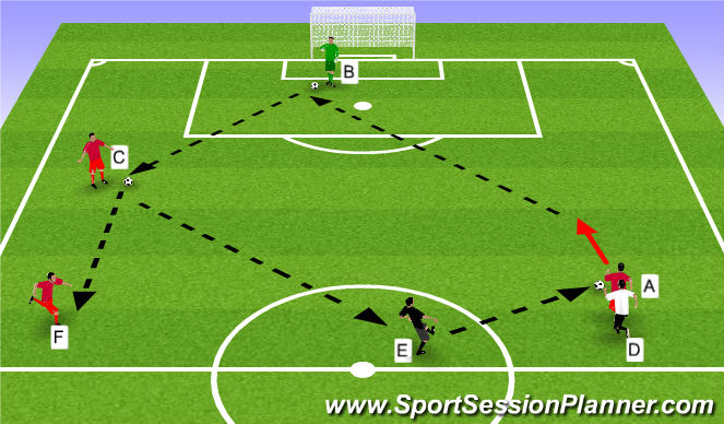 Keeper B plays to defender C makes a decision to play out wide to player F who has run back to support or back inside to player E. Players follow thier pass to take up the new position except the keeper. Players make good decisions on moving wide and in to good open safe position. Keeper move away from goal to avoid mistakes. Back foot receiving, inside foot pass for accuracy.