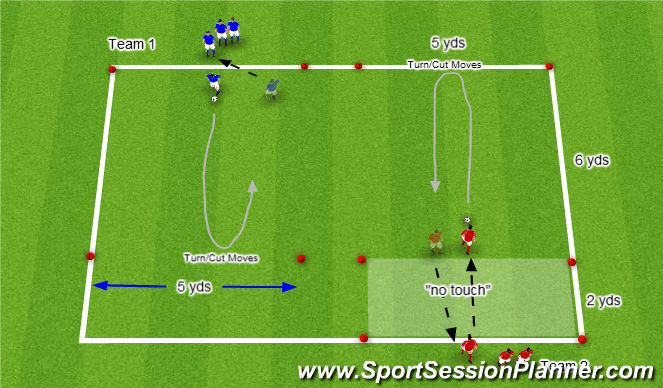 Technical Warm-up: Divide players up evenly, area of 8 x 10 yards and set up the cones as in the diagram, creating two zones. One zone is 6 x 5 yards the other is 8 x 5 yards including a two-yard zone at the end.