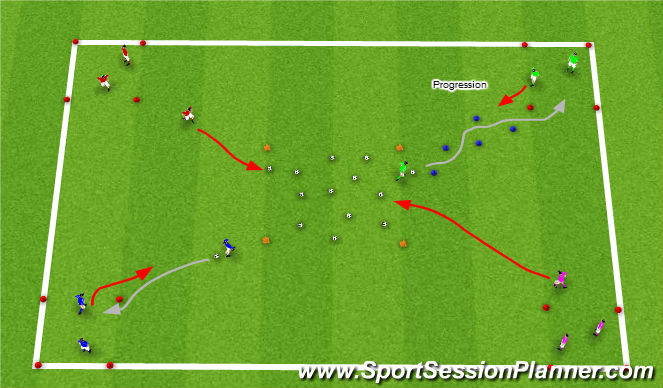 - Random amount of cones outside the middle square leading to the team bases that the players have to dribble around.