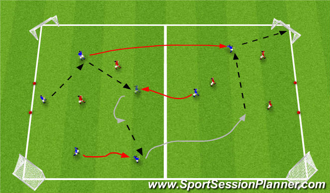 Organization: Set up an area of 50 x 30 yards, with target goals in the corners and a three-yard centre gate between the goals at each end. 10 players in this session.