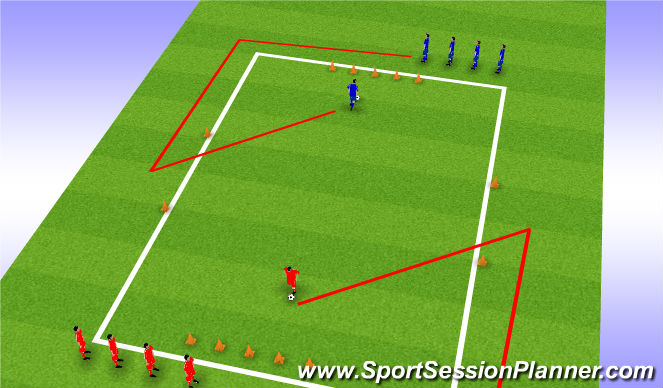 Set Up: cones acting as goals and a coned gate for each team, as shown Split players into two teams, number players in each team 1 to 6. Place a team on opposite corners, as shown, with soccer balls.