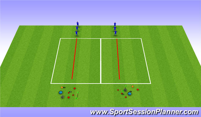 Set Up: Split players into groups of 3 (depending on numbers). Players all start at one end line. Coach should place treasure at one end of a team’s area; cones, water bottles, bags, etc.