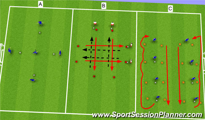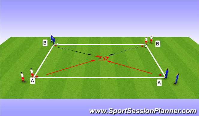 -player will start on the outside of the cone and then move inwards and to the left or right, executing 4 passing back (2 to player A and 2 to player B)