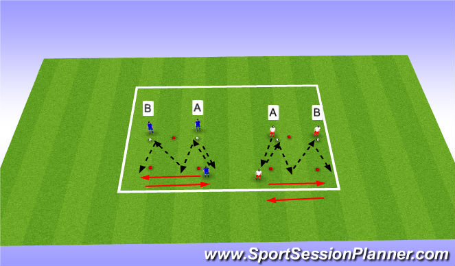 -Player A without ball moves pass the center cone and then recieve pass from player B performing outside cuts. Player A passes back to where he was coming from and pattern alternates with other side.