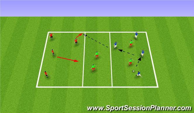 Use a 40x25 grid with a 10 yard zone in the middle. Divide players into three teams with four players per team. One team in each zone. The team in the middle is defending, two players are allowed to leave the zone to go pressure the team of 4 that has the ball. While the other 2 defending players try to intercept the pass across. Team on the outside is trying to connect a minimum of 3 passes before they play a pass along the ground to the other team of 4 on the opposite side of the grid. Once a team loses the ball, they become the defending team.