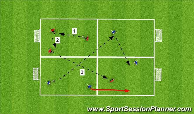 Players pass the ball around the sequence and follow their pass. Passes 1 and 4 are long and passes 2, 3, 5 and 6 are short passes.