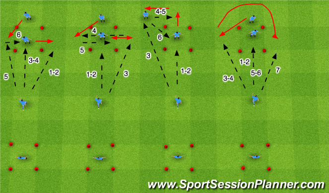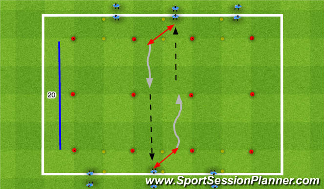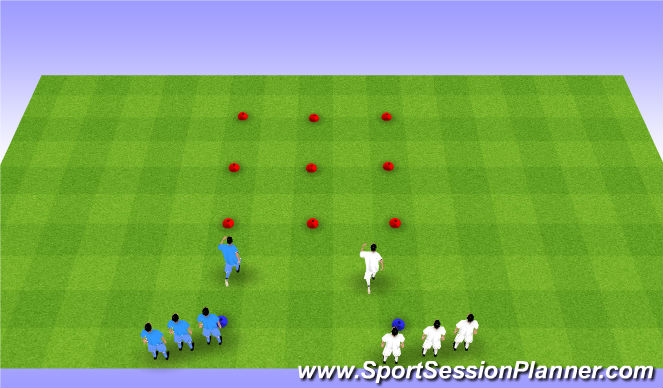 - First player in line dribbles to the middle of lane and executes a change of direction skill, then passes back to the line they came from, returns to the end of the line
