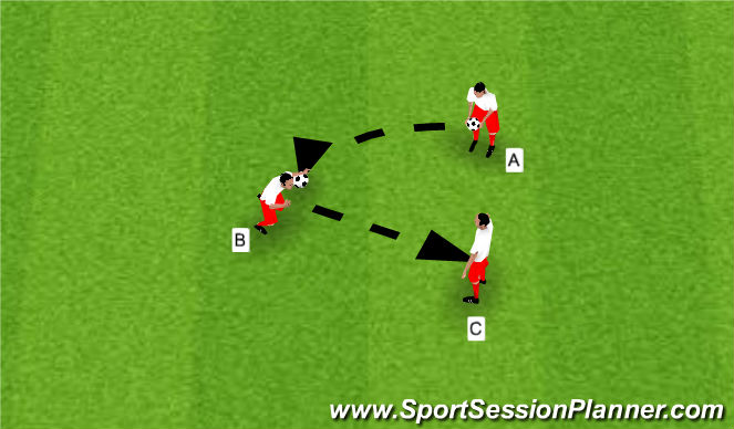 Player A throws to Player B, who heads the ball over Player A to Player C. Player C controls the ball and returns it to Player A. It then becomes Player C's turn to head the ball. Players rotate every 2 mins.