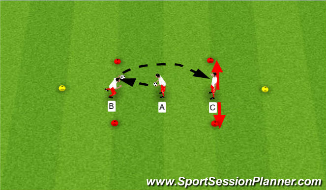 4. the next receiver (in the above example Player C) must move to one of the two cones, at the point Player A serves the ball to Player B, so as to make a target for Plaer B to head the ball to.